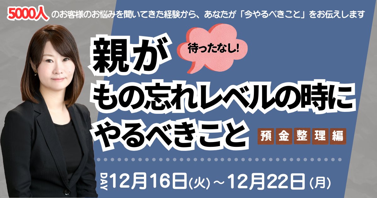 本セミナーでは、5000人のお客様のご家族のお悩みを伺い、それぞれに最適な選択肢をご紹介してきた家族信託コーディネーターの小牟田が、「待ったなし!親がもの忘れレベルの時にやっておくべきこと!〜預金整理編〜」と題して、今日からできる老親の生活のための一歩をお伝えします。