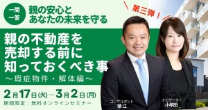 | 対象 | ・親が75歳以上の方 ・親が自宅不動産を保有している方 ・親の不動産をどうするか迷っている方 ・親の不動産の売却を賢く進めたい方 ・親の不動産の状態に不安がある方 |